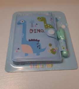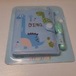 دفترچه یادداشت طرح دایناسور همراه با مینی خودکار که رنگ جوهر خودکار آبی است.